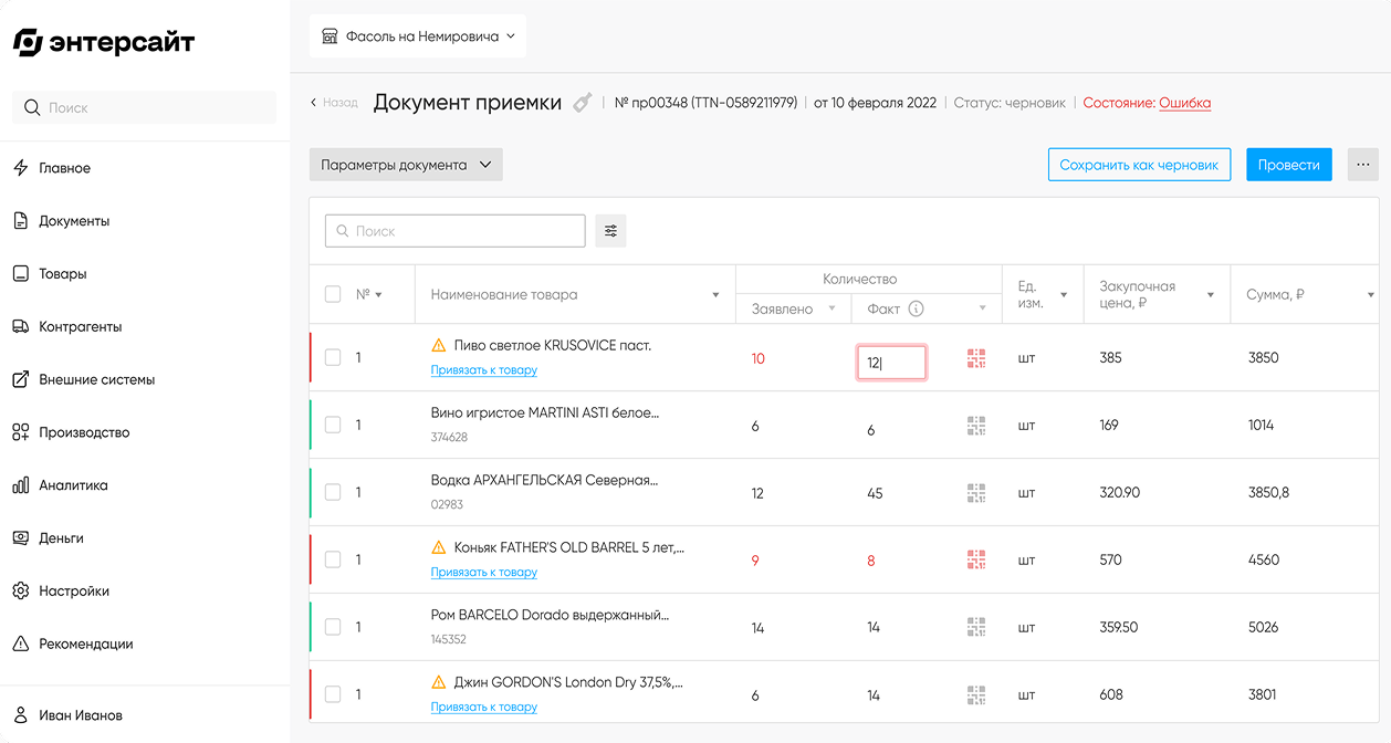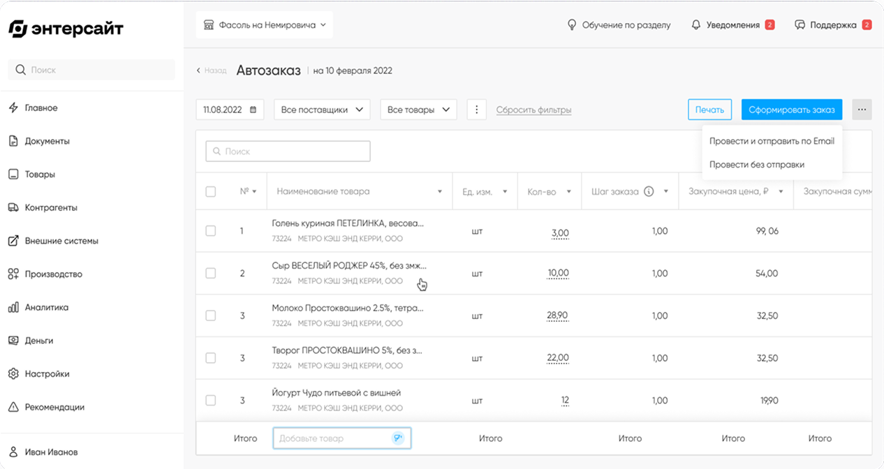 Система сама предлагает заказывать нужные товары и показывает расхождения с учётом.